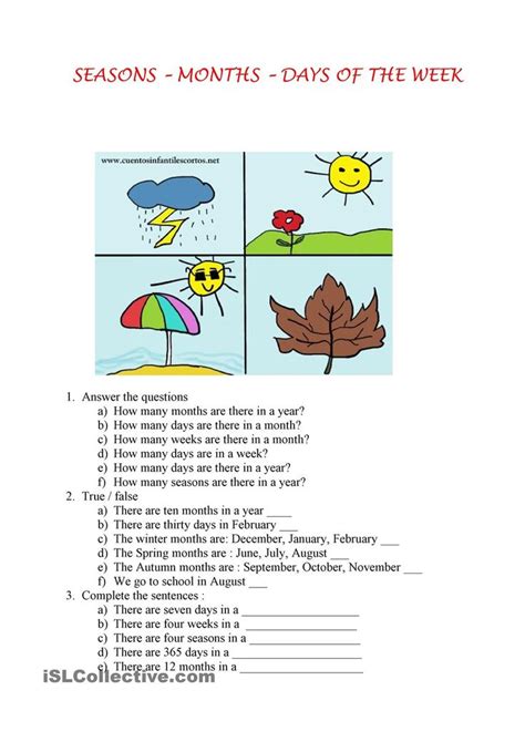 Based on the images provided, your child needs to determine the season and write it on the line. Months and seasons English as a Second Language (ESL) worksheet. Seasons Interactive worksheets Language: English Subject: English as a Second Language (ESL).