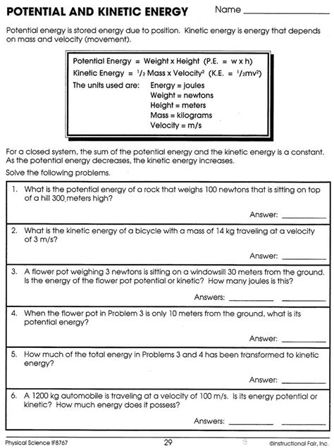 Potential And Kinetic Energy Worksheet Answers | Kinetic ...