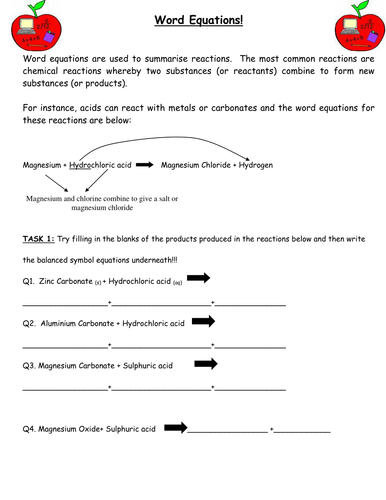 Word Equations Worksheet Chemfiesta. Literal equation worksheets help to hone the skills like rearranging the literal equations, rearrange and evaluate, word problems containing real-life applications and a lot more are included. A math equation is a statement that simply says two things are equal.