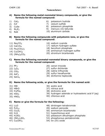 Worksheets are often loved by learners since they're usually non-intimidating and user-friendly in addition to providing a finite exercise (ideally one page) where learners get rapid feedback and might often judge for their own reasons their. Inorganic Nomenclature is a drill-and-practice tutorial on naming simple inorganic compounds and writing chemical formulas consisting of multiple-choice questions. BINARY COMPOUNDS (contain two elements): Name the more metallic element first and the less metallic element second, putting an "-ide" ending on the less metallic element.
